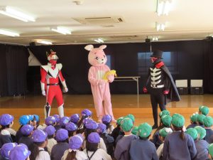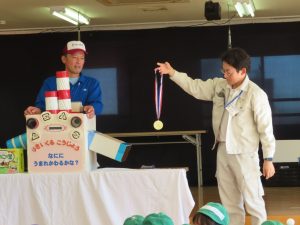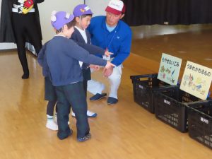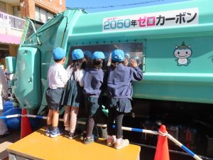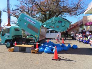 ・11月25日(月)藤沢市環境事業センターの方々が来て下さり、「ごみ体験学習会」を開催しました。年長さんが、紙芝居と劇でごみの現状やリサイクルの大切さについて学んだ後、「ごみ分別ゲーム」を楽しみました。「ポイ捨て男爵」と「リサイクルレッド」が登場する劇には大興奮でした。その後、園庭で年中少クラスも一緒にパッカー車を間近で見学しました。