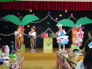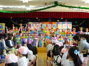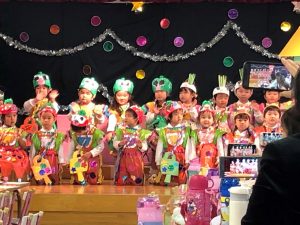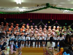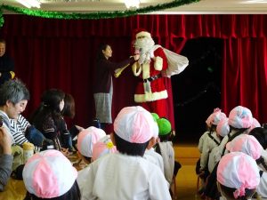 ・12月19日(木)と20日(金)の2日間、3つのグループに分かれて、「たのしいつどい」が行われました。年少さんから年長さんまでクラスごとに自分たちで考えて作ったオリジナルの劇を元気いっぱい披露しました。その他に年長さんはリトミックの成果として自分たちで作ったオリジナルの曲を歌や動きをつけて表現しました。3学年そろっての合奏も頑張りました。みんなの頑張りにちょっと気の早いサンタさんがプレゼントをもってかけつけてくれました♪