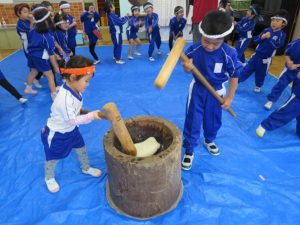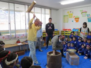 その後、交代で「ぺったんこ、それぺったんこ」とみんなで歌を歌いながら少しずつおもちつきを楽しみました。お正月に食べるおもちが待ち遠しいですね!