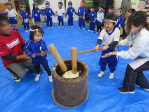 その後、交代で「ぺったんこ、それぺったんこ」とみんなで歌を歌いながら少しずつおもちつきを楽しみました。お正月に食べるおもちが待ち遠しいですね!