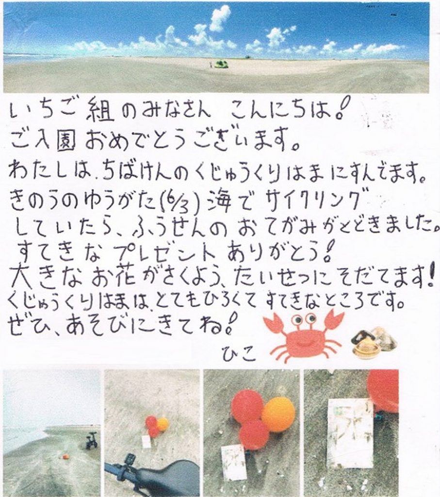 ・とってもうれしいニュースです。6月2日(火)の入園式で飛ばした、お花の種をつけた風船を拾ってくれた方(ひこさん)からお手紙が届きました。なんと風船は千葉県の九十九里浜まで飛んでいったそうですよ。とてもいい人が拾って下さって、九十九里の広い海と空のステキな写真も送ってくれました。九十九里浜の方で、きれいなお花を咲かせてくれるといいですね!
