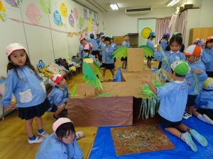 ・10月24日(木)と25日(金)に本園自慢の行事である「幼稚園祭」が開催されます。今年のテーマは、「ドキドキアニマルランド」です。園では今、幼稚園祭に向けての選択保育が行われていて、子ども達は「動物」をテーマにして様々な大型遊具の製作に取り組んでいます。子ども達が創り出す動物の世界を楽しみにしていてください♪