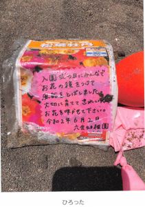 6月2日、入園式の日にみんなで飛ばした風船が、飯岡海岸(千葉県)まで届き、6月5日にアーティストの方が拾って下さいました。そして、6月9日にタネを植えていただいたそうです。すると6月10日には芽が出て、7月13日には1つめの花が咲いたそうです。