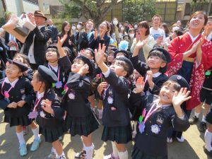 ・園庭で飛ばした風船も青空に吸い込まれるように高く舞い上がっていきました。これからもたくさんのお友だちを作って、たくさん遊んで たくさん勉強して、優しく立派な人に成長していって下さいね。先生たちはいつまでも応援しています!