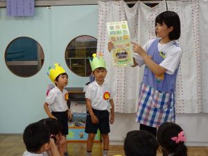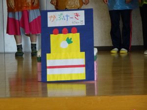 ・3階ホールで先生たちが熱演する劇を楽しみました。今年の演目は「大きなかぶ」で、なかなか引き抜けないかぶを子どもたちも一緒になってかけ声をかけて応援しました。やっと抜けた大きなかぶで「かぶケーキ」を作ってお誕生日をお祝いしました。