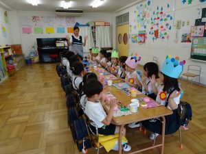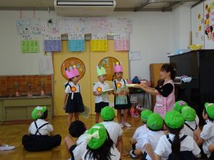 ・夏休みに入り、しばらく静かだった園庭に元気な声がもどってきました。夏期保育初日は、お楽しみ会と8月のお誕生会です。