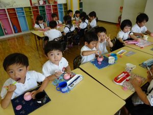 ・各保育室にもどってお誕生月のお友だちをお祝いして、みんなでおやつのシャーベットを食べました。冷たくてとってもおいしそうでした!