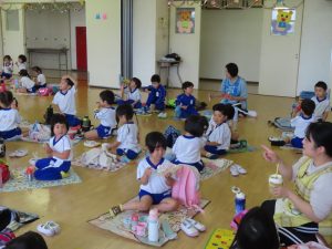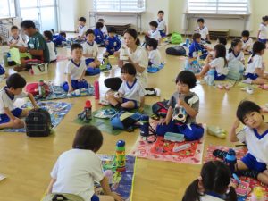 今日は、持参したお弁当を、3階ホールで、換気に配慮しながら、みんなで楽しくいただきました。保育室の昼食とは雰囲気の異なるとても楽しい時間になりました。
