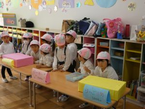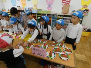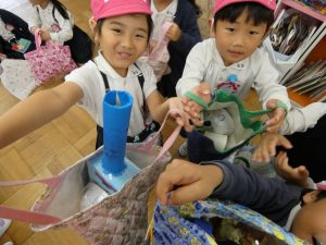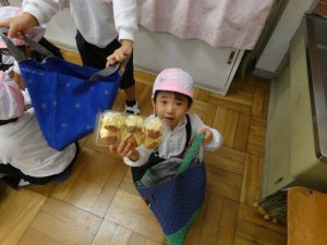 10月31日(木)は、後日祭でお買い物ごっこを楽しみました。幼稚園祭に向けて製作した美味しそうな「食べ物」や「飲み物」、ステキな「おもちゃ」などを売り手と買い手に分かれて「特製地域通貨:」を手に「いざ!お買い物へ出発~!」