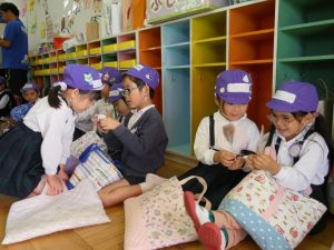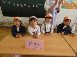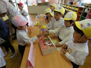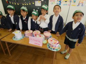 10月31日(木)は、後日祭でお買い物ごっこを楽しみました。幼稚園祭に向けて製作した美味しそうな「食べ物」や「飲み物」、ステキな「おもちゃ」などを売り手と買い手に分かれて「特製地域通貨:」を手に「いざ!お買い物へ出発~!」