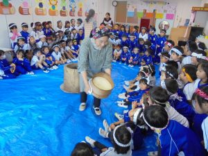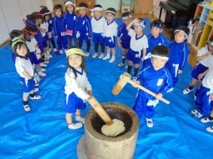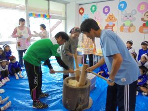 最初に蒸したもち米を見せてもらい、「これがおもちに変身するんだ!?」と興味深々にのぞきこんでいました。その後、みんなで「ぺったんこ、それ、ぺったんこ!」と歌いながら交代でおもちをつきました。