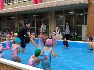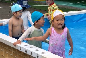 あいにくの曇り空でしたが、気温と水温を確認し、プールの保育を行いました。最初は緊張気味のお友だちもいましたが、だんだんとエンジンがかかってきて、園庭いっぱいにお友だちの歓声が広がっていました。今度のプールの保育も、みんなで楽しくがんばりましょう!