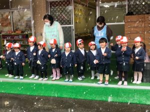 ・予報通りに2月5日(月)正午ごろから雪が降り始めました。降園時に「道路は安全に歩けるだろうか?」「バスは安全に運行できるか?」と、降園時間まで雪が積もらないようにと祈るような思いでいた時に、子ども達の歓声が聞こえてきました。テラスには、降ってきた雪に大喜びして、雪を触ろうとする子ども達の姿がありました。子ども達の純粋な姿に心が和みました。