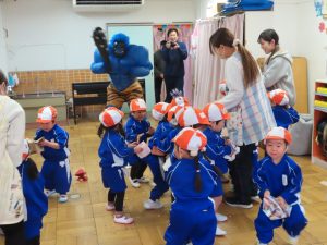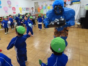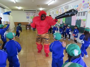 ・今年の節分は2月2日(日)だったそうですが、園では本日、豆まきをしました。子ども達は、鬼が来る前から神妙な様子で、中には目に涙を浮かべている子もいました。太鼓の音とともに鬼が保育室に入ってくると勇敢に鬼に立ち向かって豆を投げる子や逃げ回る子、泣きべそをかいて先生の陰に隠れる子など様々でした。それでもみんなで勇気を出して鬼を退治しました。みんな今年もよい子で頑張れると思います。