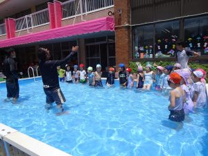 ・6月24日(月)、今年も子ども達が楽しみにしていたプール開きの日がやってきました。夏の陽ざしが降り注ぐ絶好のプール日和となり、子ども達は冷たい水に大はしゃぎでした。今年もたくさんプール遊びができるといいですね! ・