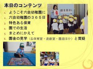 六会幼稚園の「保育の特徴」や「園での生活365日」「園舎の見学(各保育室・遊戯室・園庭ほか)と質疑」などを主な内容とします。
