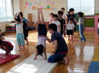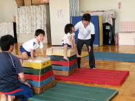 専門指導者によるマット、跳び箱、鉄棒などの体操指導を行っています。縄跳びやボール運動などもとりいれ、楽しみながら運動能力の向上をはかるとともに、たくましい心も育んでいきたいと考えています。