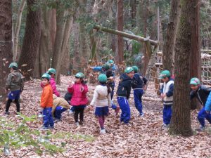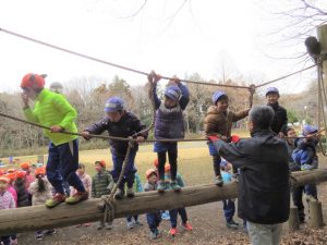 お別れ遠足で少年の森に行きました♪ ・2月8日(金)、年長さんが御所見にある少年の森へお別れ遠足に行きました。少し寒い日でしたが、みんな寒さに負けないで元気にアスレチック遊具に挑戦したり、枯れ葉と戯れたりして楽しい時間を過ごしました♪ ・いよいよ年長さんは卒園まで残すところひと月ちょっとになりましたね。お弁当の時も小学校のことが話題になっていました。残りわずかな幼稚園生活を最後まで思い切り楽しんでくださいね! ・