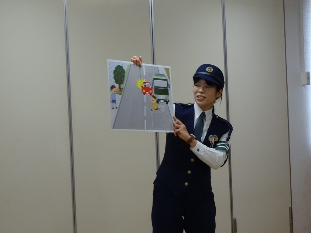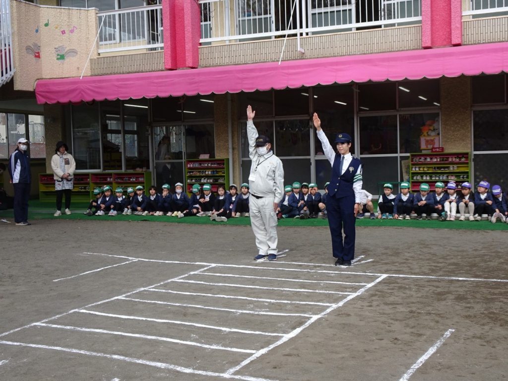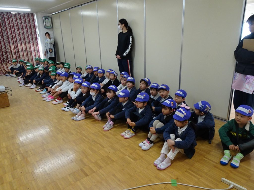 年長さんが交通安全教室で交通ルールを学びました。 ・4月から小学生になる年長さんのための交通安全教室が開催されました。最初に3階ホールで藤沢市の交通安全課の方とおまわりさんから映像やお話で交通ルールと安全な道路の歩き方について指導を受けました。みんな真剣に話を聞いていました。その後、園庭に出て模擬信号を使って、左右を確認して右手をあげて横断歩道を渡る練習をしました。年長さんは、今日きいたお話や練習したことを忘れないで安全に小学校に通って下さいね。 ・