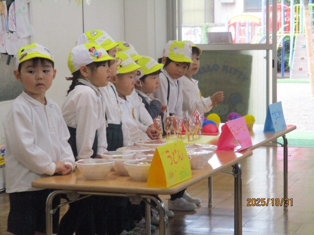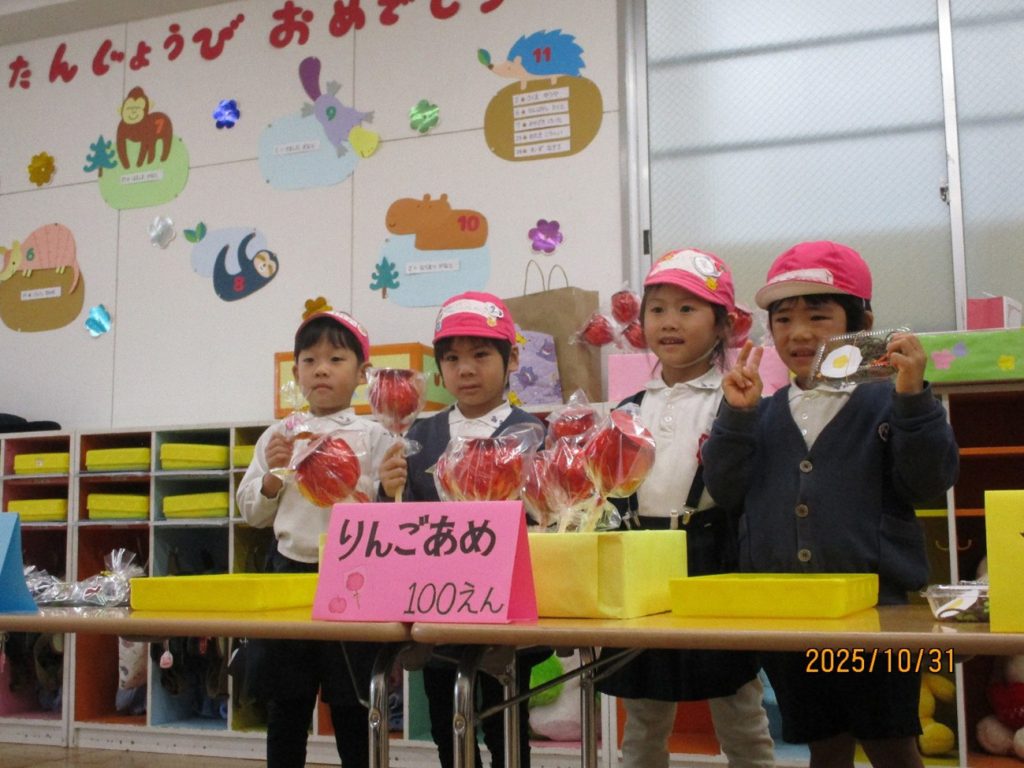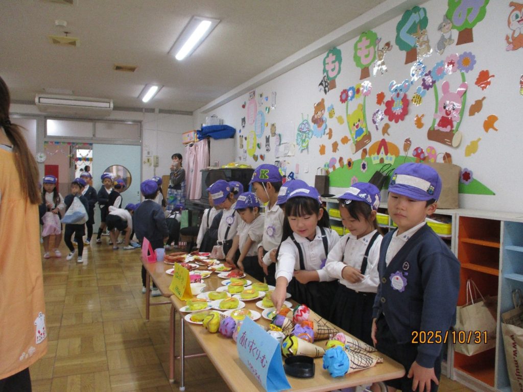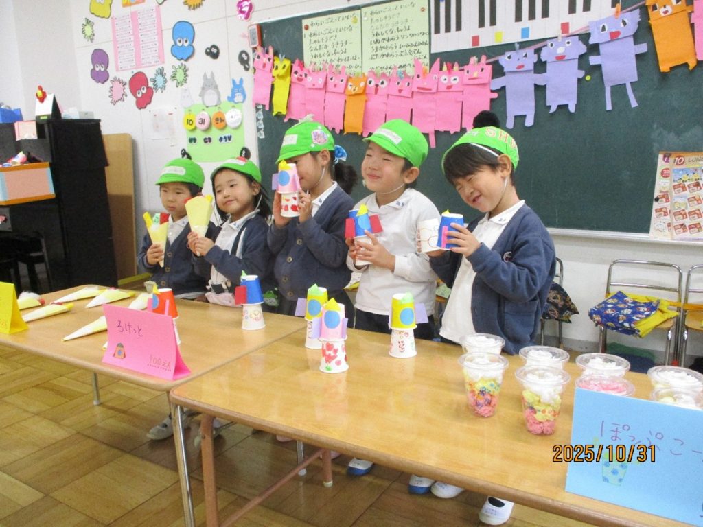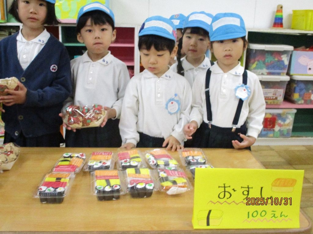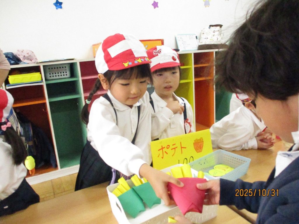 後日祭:お買い物ごっこ 10月31日(金)は、後日祭でお買い物ごっこを楽しみました。 幼稚園祭に向けて、みんなでつくった美味しそうな「食べ物」や「飲み物」、そして、ステキな「おもちゃ」などを、売り屋さんと買い物に来たお友だちに分かれて、六会幼稚園の「地域限定通貨」を手に、「いざ!お買い物へ出発しました!」 売り切れのお店がたくさんで、みんな楽しそうでした。 買ったものを、うれしそうに見せてくれるお友だちもいましたよ。 みんな、上手に買い物ができたかな!? ・